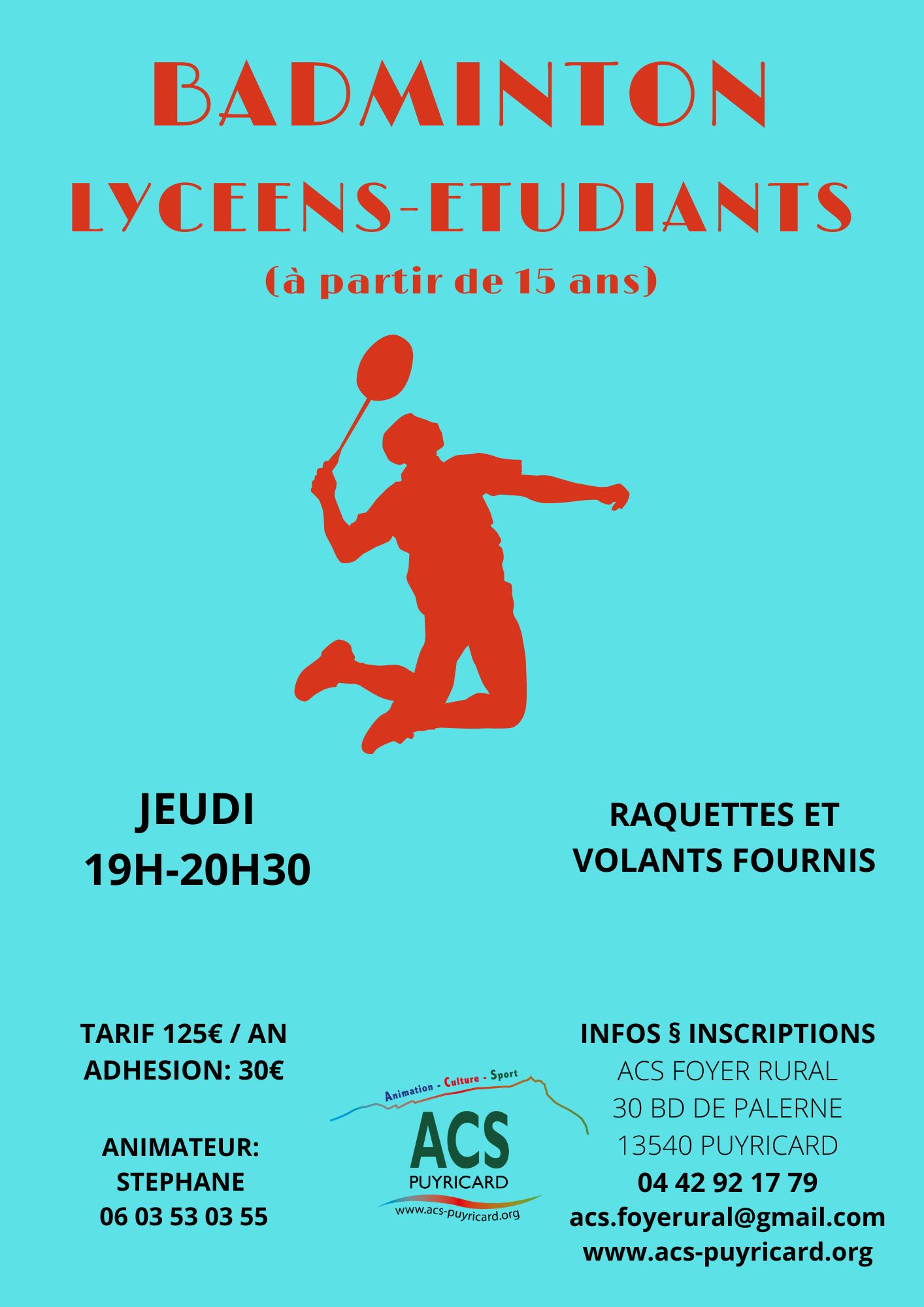 Rejoignez la section Badminton lycéens-étudiants de l'ACS Puyricard et venez jouer le jeudi soir (19h00-20h30).