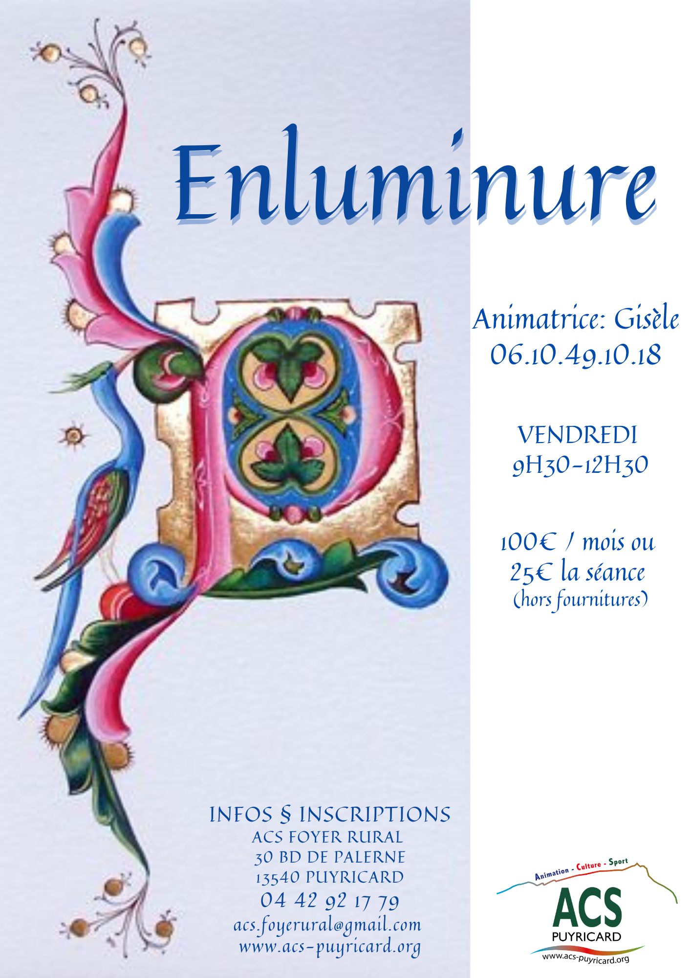 L'enluminure est une ornementation, c'est une image qui décore, illustre un texte. C'est une activité artistique proposée par l'ACS le vendredi de 9h30 à 12h30.