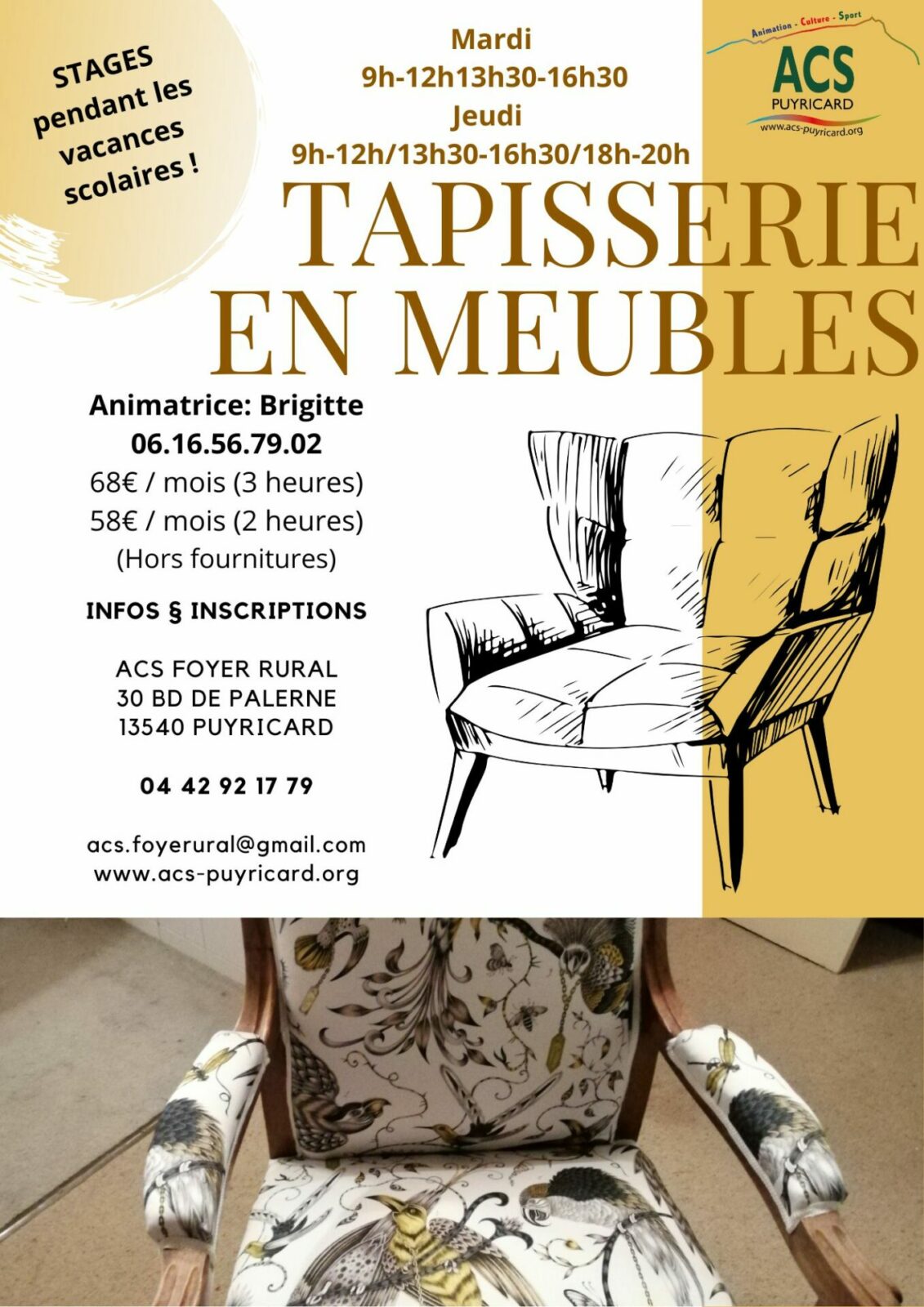 Les lundis (9h00-12h00), mardis (13h30-16h30) et jeudis (9h00-12h00/13h30-16h30/18h00-20h00) l'ACS Puyricard propose un atelier de Tapisserie en Meubles.